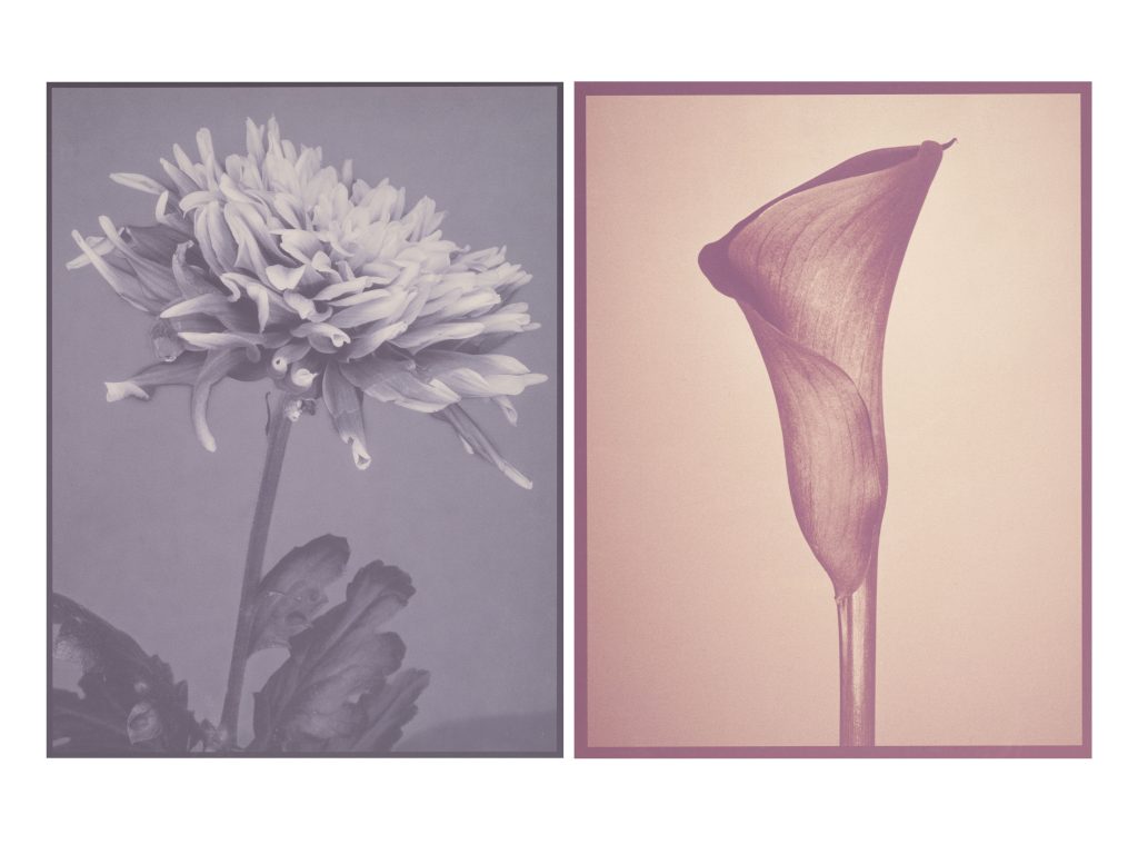 黒白印画紙を用いながらも、薄紅色や薄紫色など黒以外の色調が現れることを特徴とする。